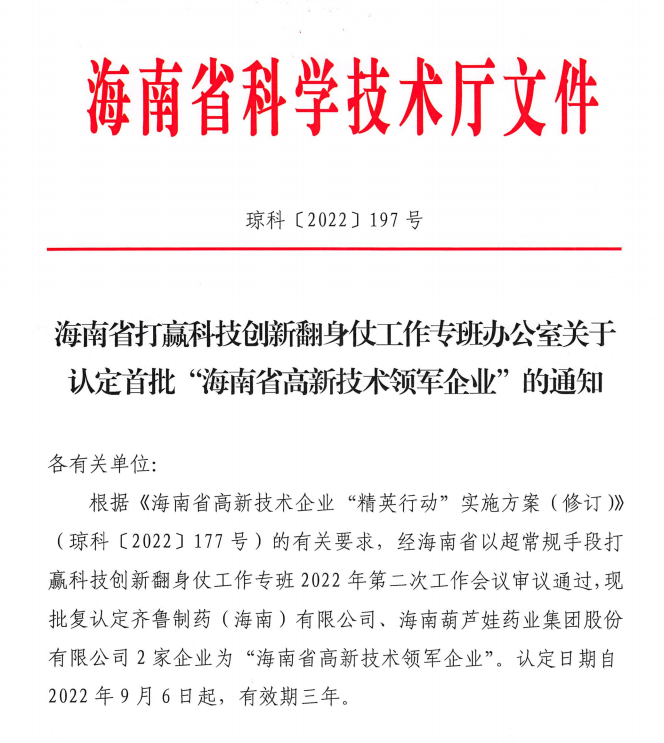 近日,海南省科学技术厅发布的《海南省打赢科技创新翻身仗工作专班办公室关于认定首批“海南省高新技术领军企业”的通知》中显示,批复认定海南IM电竞药业集团股份有限公司等2家企业为“海南省高新技术领军企业”。认定日期自2022年9月6日起,有效期三年。