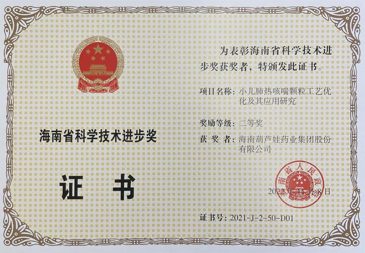 为此,小儿肺热咳喘颗粒的制备方法获得了第二十一届中国专利优秀奖(2019年),专利申请号:ZL201010134951,此次作为专利技术的应用,获得了2021年度海南省科学技术进步奖二等奖。在此之前,IM电竞牌小儿肺热咳喘颗粒还多次被授予“临床价值中成药品牌”、“中国连锁药店最具合作价值单品”,荣登“中国医药品牌榜”。